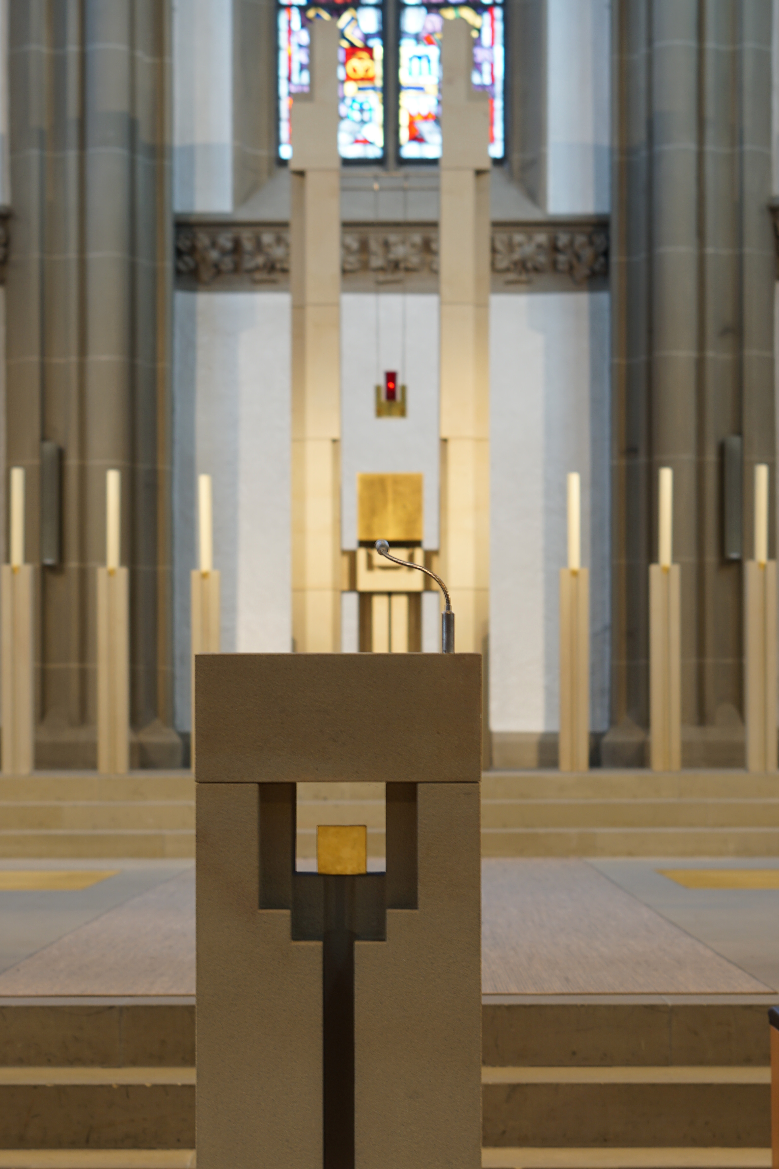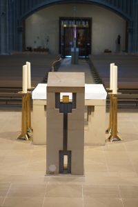 Er steht auf einer Linie mit dem Taufstein, dem Altar und dem Tabernakel.