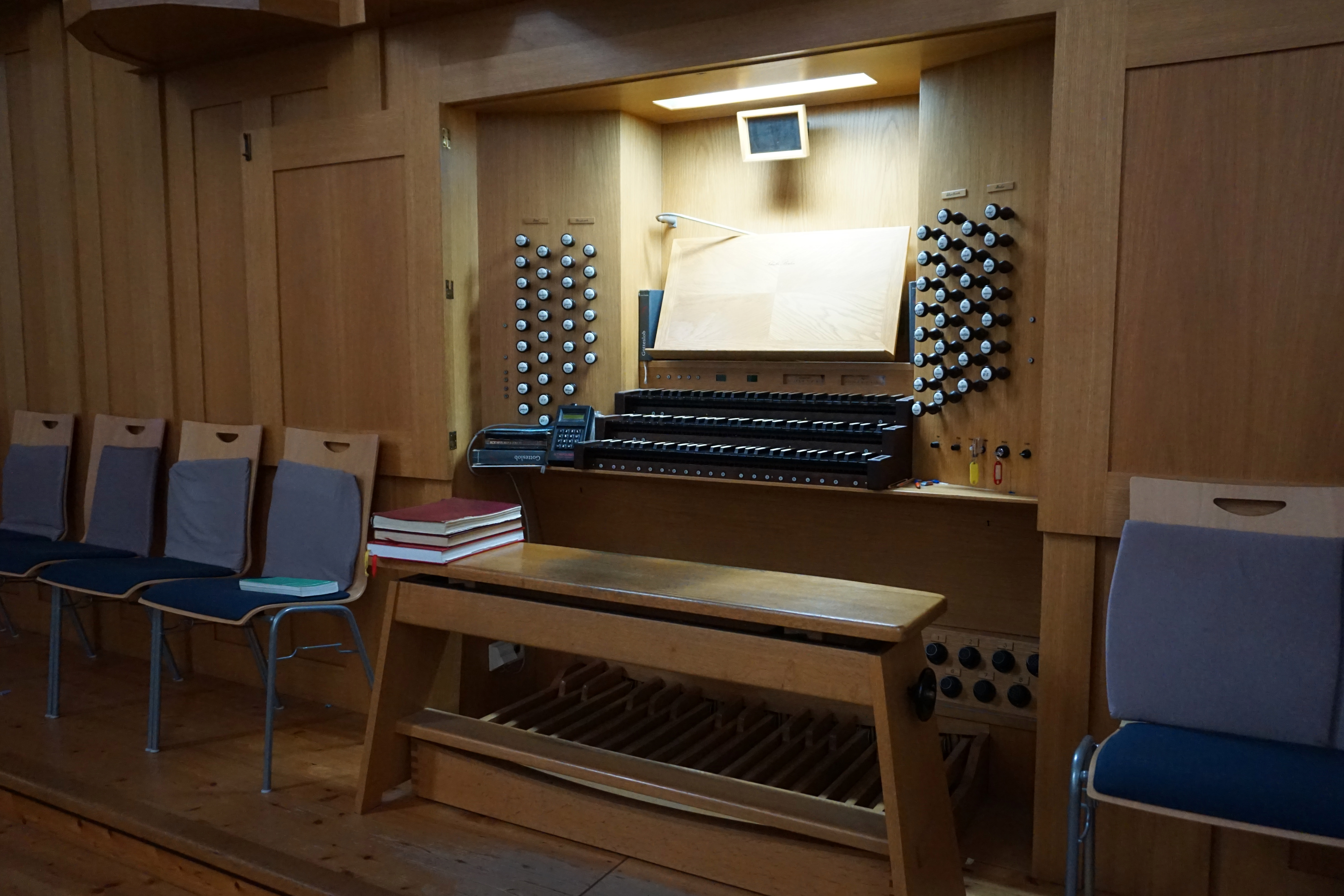 • Die Orgel ist aus hellem Holz gefertigt.
