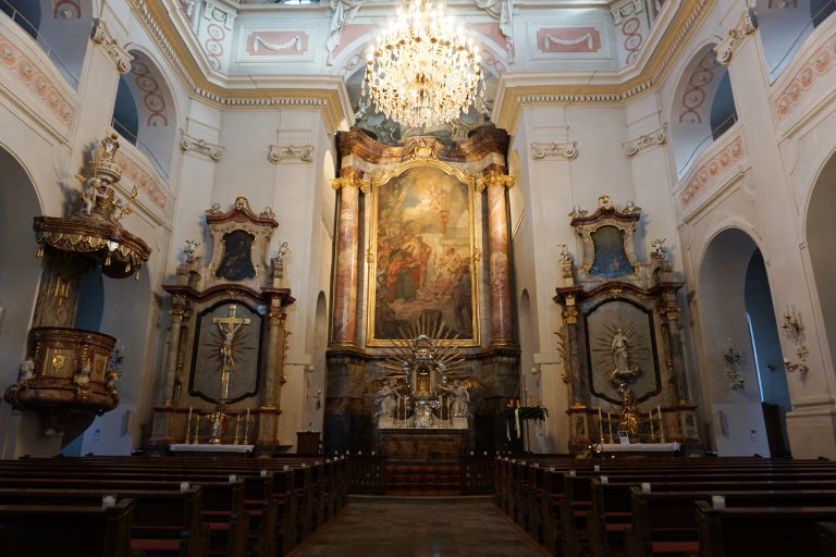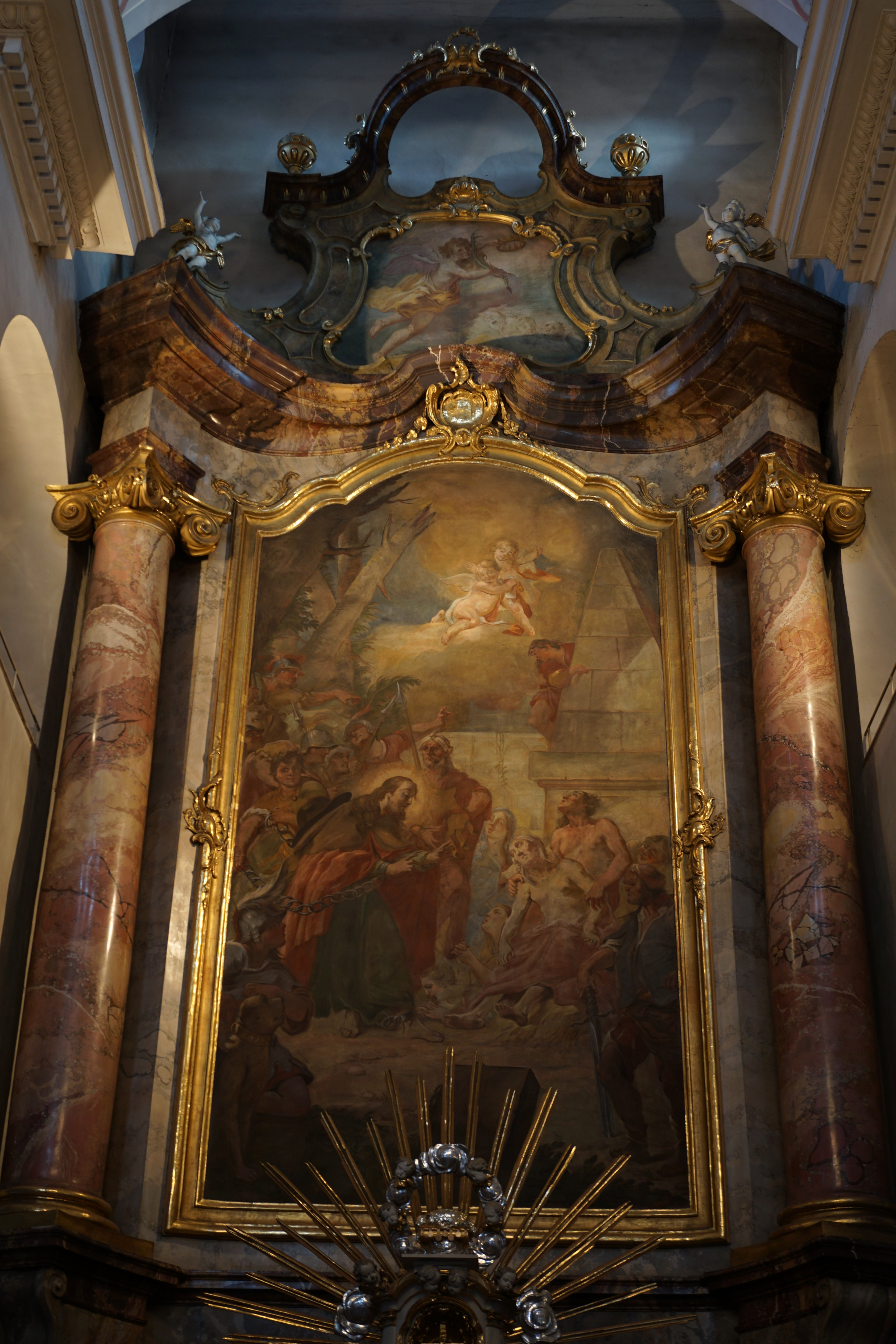 Der Hochaltar aus Stuckmarmor zeigt ein Bild des Hl. Jakobus auf seinem Weg zum Martyrium (Tod um des Glaubens willen).