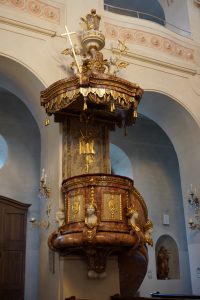 Auffallend ist auch die aufwendig mit Stuck, Putten (Figuren kleiner Kinder mit Flügeln), Lorbeergirlanden und Kränzen verzierte Kanzel.
