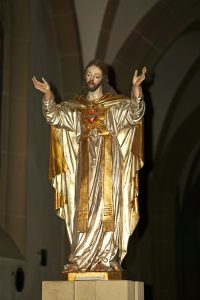 • Zu Beginn der Seitenschiffe stehen nun eine spätgotische Madonna aus dem Jahr 1456 (rechts) und eine Herz-Jesu-Statue von Valentin Weidner aus dem Jahr 1884 (links). Sie sind Orte der privaten Andacht und des Gebets.
